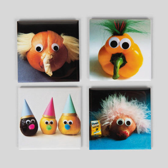 These marvelous magnets feature some of our most creative characters! Each 2 inch square full-color magnet sticks to most metal surfaces and introduces a produce personality like you’ve never see in your kitchen including: